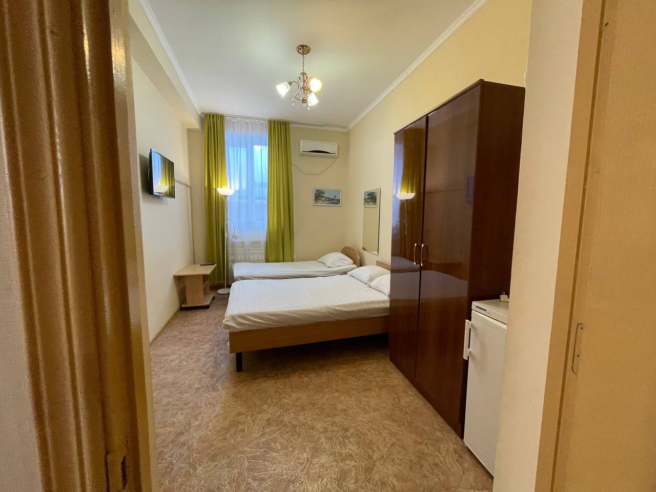 Standard room на 2-3 человека Удобная уютная комната на 2-3 человека, состоит из одной спални, где может отдохнуть как компания из трех человек, так и семья с одним ребенком. В ней есть сплит система, цифровой телевизор, холодильник, одна двухспальная кровать и одна односпальная, свой санузел. Цена указана за двух человек, при заселении более двух человек цена по договоренности.